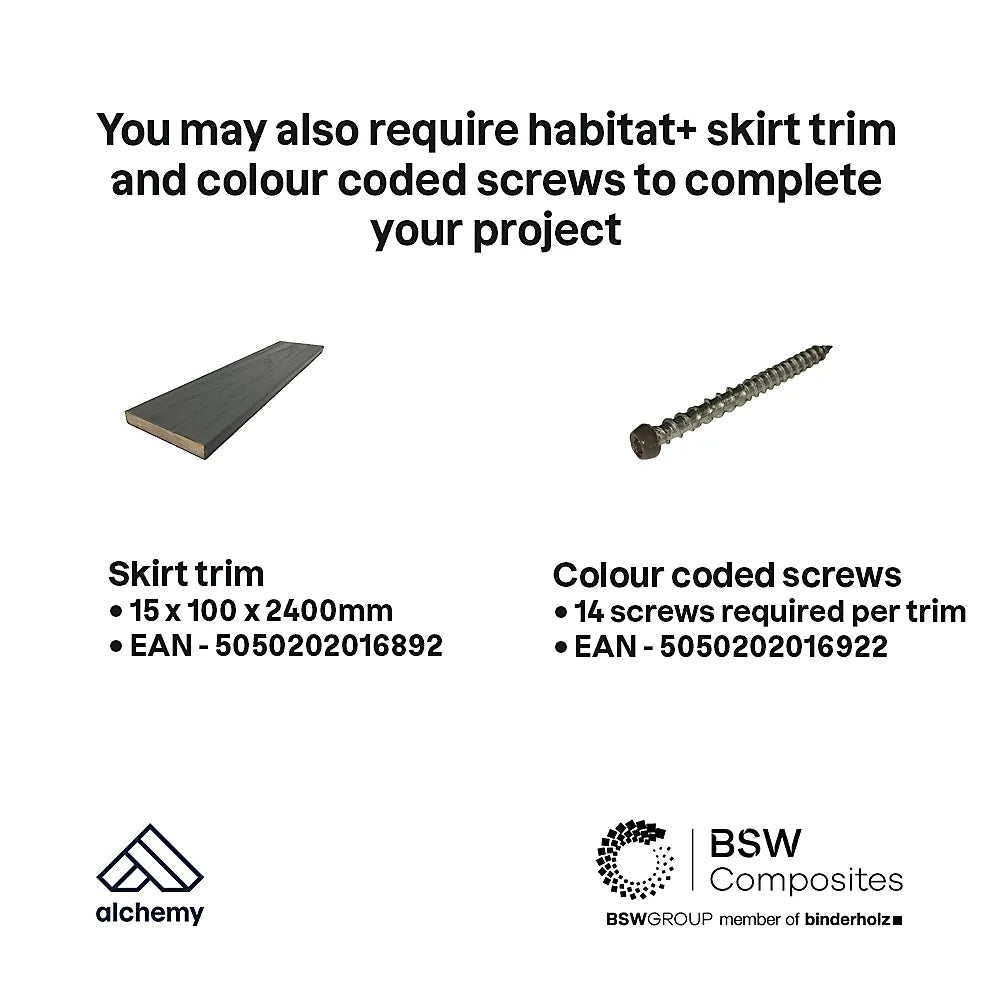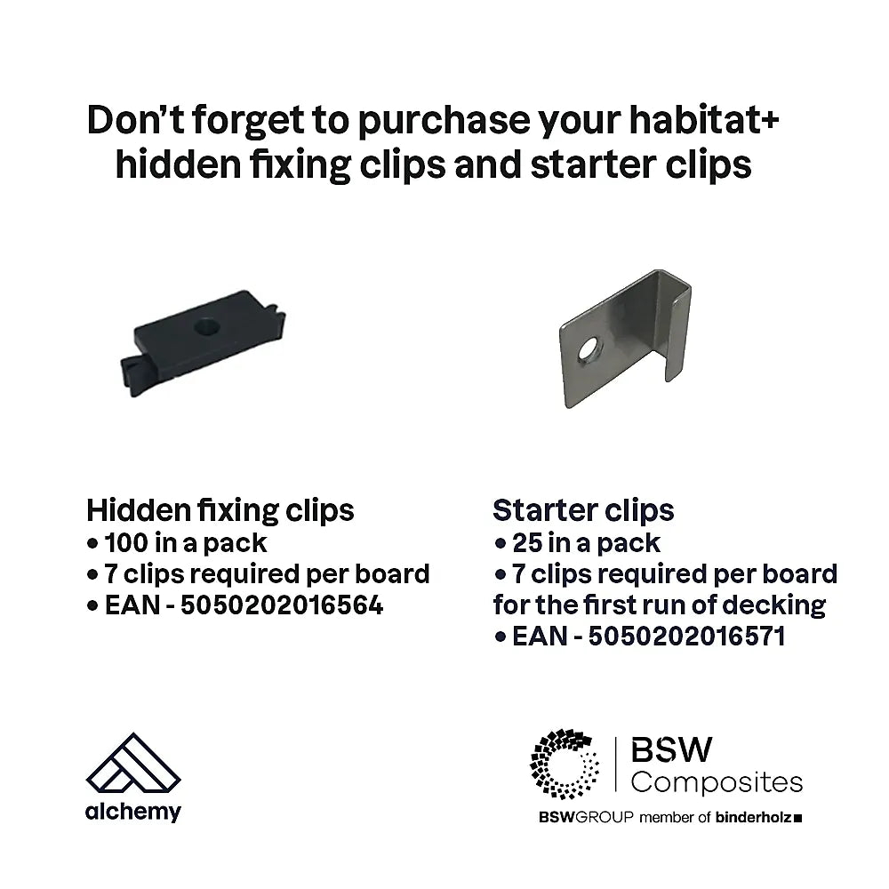- Installation: Use recommended Habitat fixings (starter clips, hidden fixings, and screws sold separately); simple installation with screws as the fixing type.